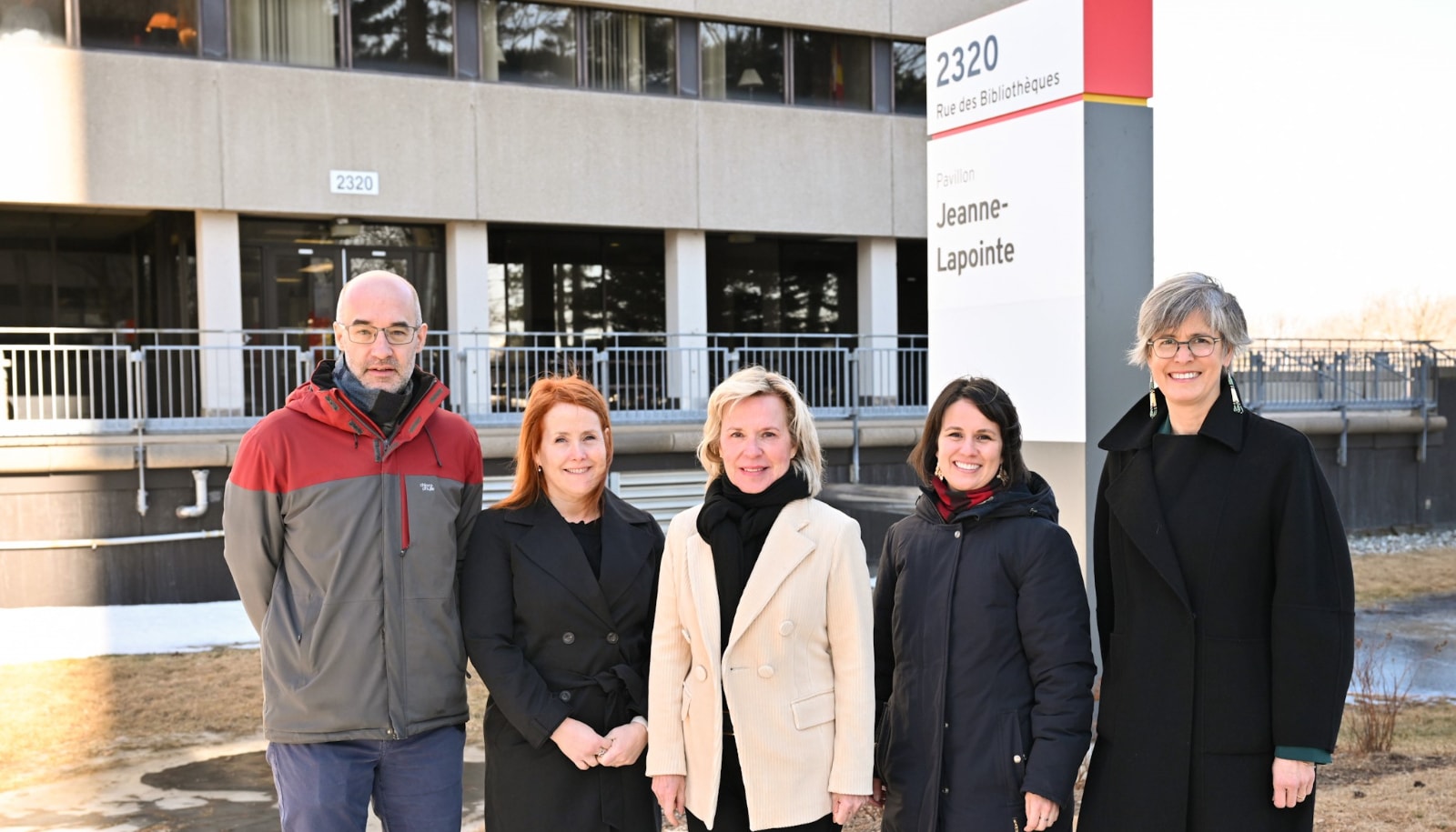 De gauche à droite: Guillaume Pinson, doyen de la Faculté des lettres et des sciences humaines, Christine Hamel, vice-doyenne aux études à la Faculté des sciences de l'éducation, Martine Biron, ministre des Relations internationales et de la Francophonie et ministre responsable de la Condition féminine, Claudia Raby, doctorante en études littéraires et biographe de Jeanne Lapointe, et Sophie D’Amours, rectrice de l’Université Laval.