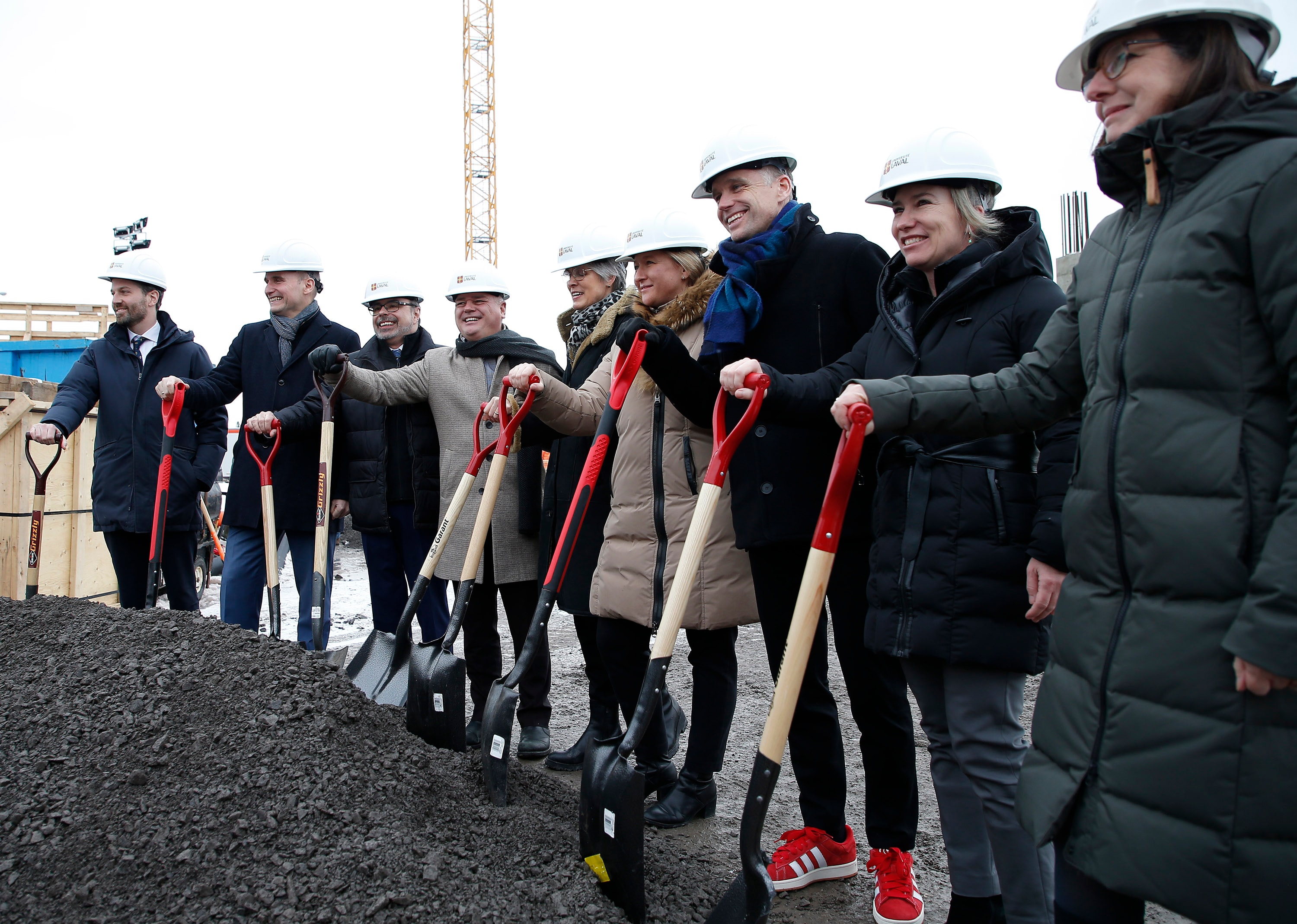 De gauche à droite, Joël Lightbound, député de Louis-Hébert, Jean-Yves Duclos, ministre des Services publics et de l’Approvisionnement du Canada, Jean-Eric Tremblay, directeur de l’Institut nordique du Québec, Jonatan Julien, ministre responsable des Infrastructures du Québec et ministre responsable de la région de la Capitale-Nationale, Sophie D’Amours, rectrice de l’Université Laval, Maïté Blanchette Vézina, ministre des Ressources naturelles et des Forêts du Québec, Bruno Marchand, maire de Québec, Eugénie Brouillet, vice-rectrice à la recherche, à la création et à l'innovation de l'Université Laval, Brigitte Bigué, directrice administrative et au développement de l’Institut nordique du Québec.