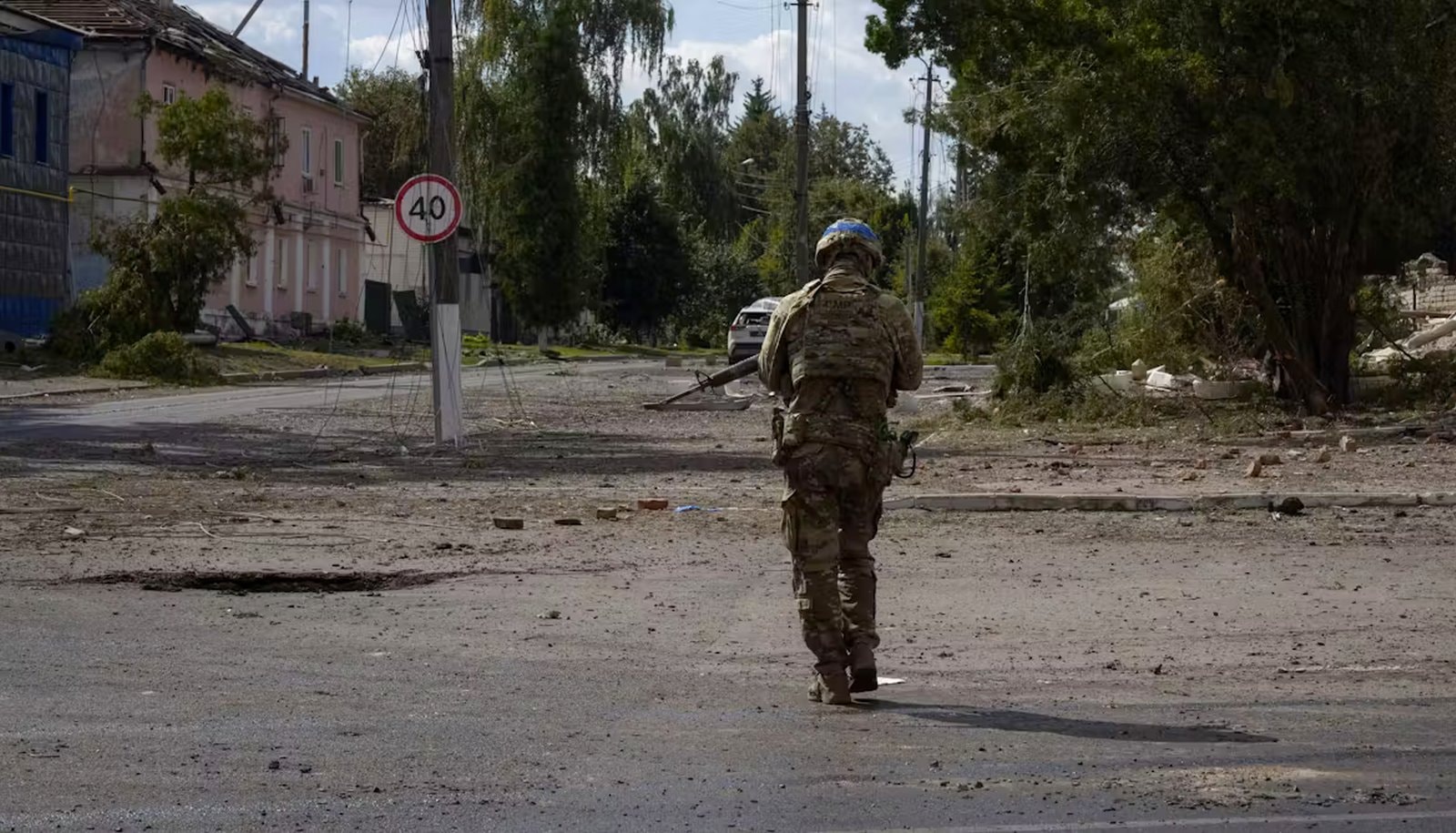 Un soldat ukrainien passe devant le centre ville de Sudzha, dans la région de Koursk, en Russie, le 16 août 2024.