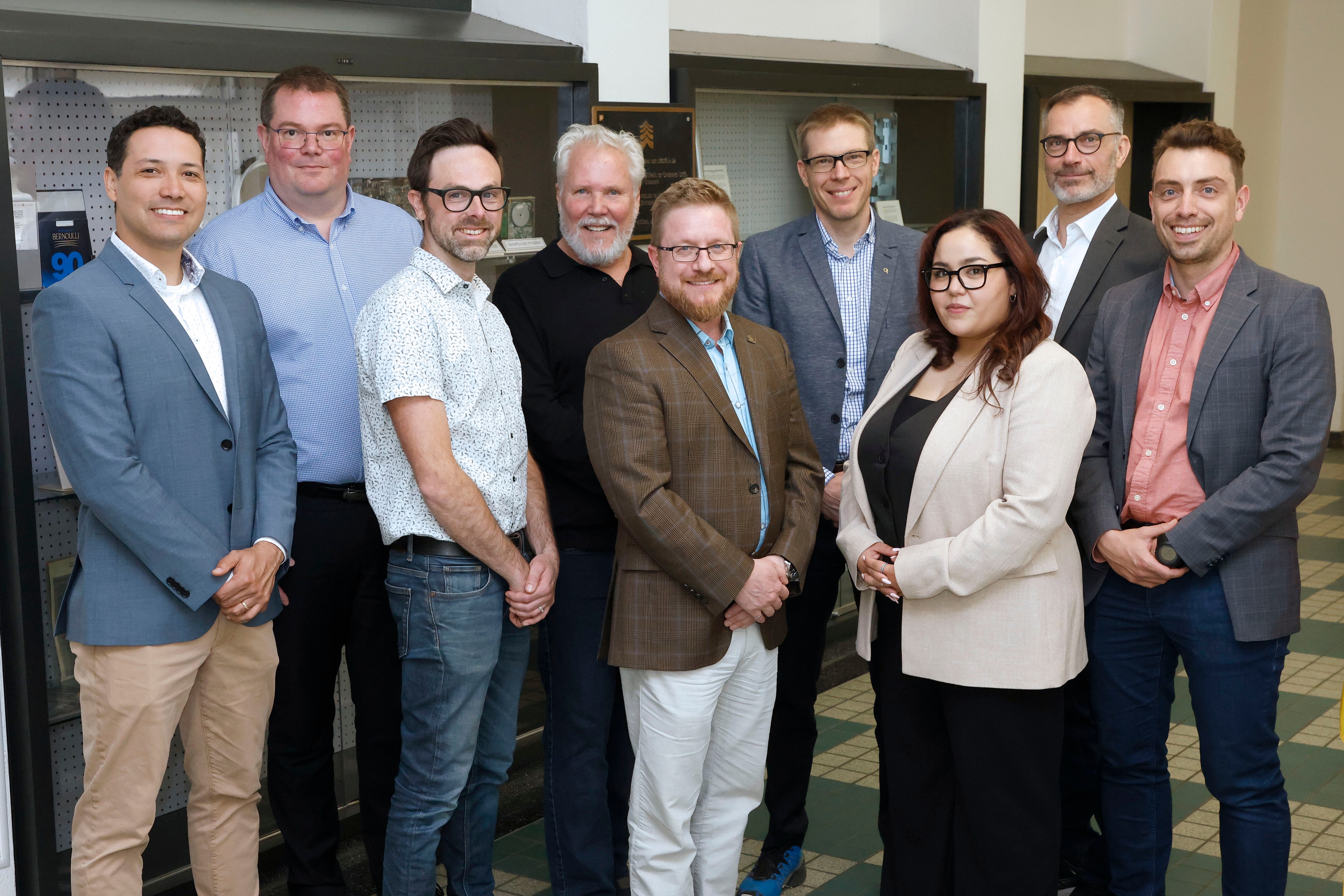 De gauche à droite: Erdrick Perez, Bruno Chouinard (Ministère de l'Environnement, de la Lutte contre les changements climatiques, de la Faune et des Parcs), Pierre-Olivier Maltais (WSP), Pascal Garand (Hatch) Jean Côté, Simon-Nicolas Roth (Hydro-Québec), Sofia Zehrouni (Englobe), Benoit Mathieu (AtkinsRéalis) et Emmanuel Charrois (CIMA+), à l’occasion du premier comité directeur de la Chaire cet été.