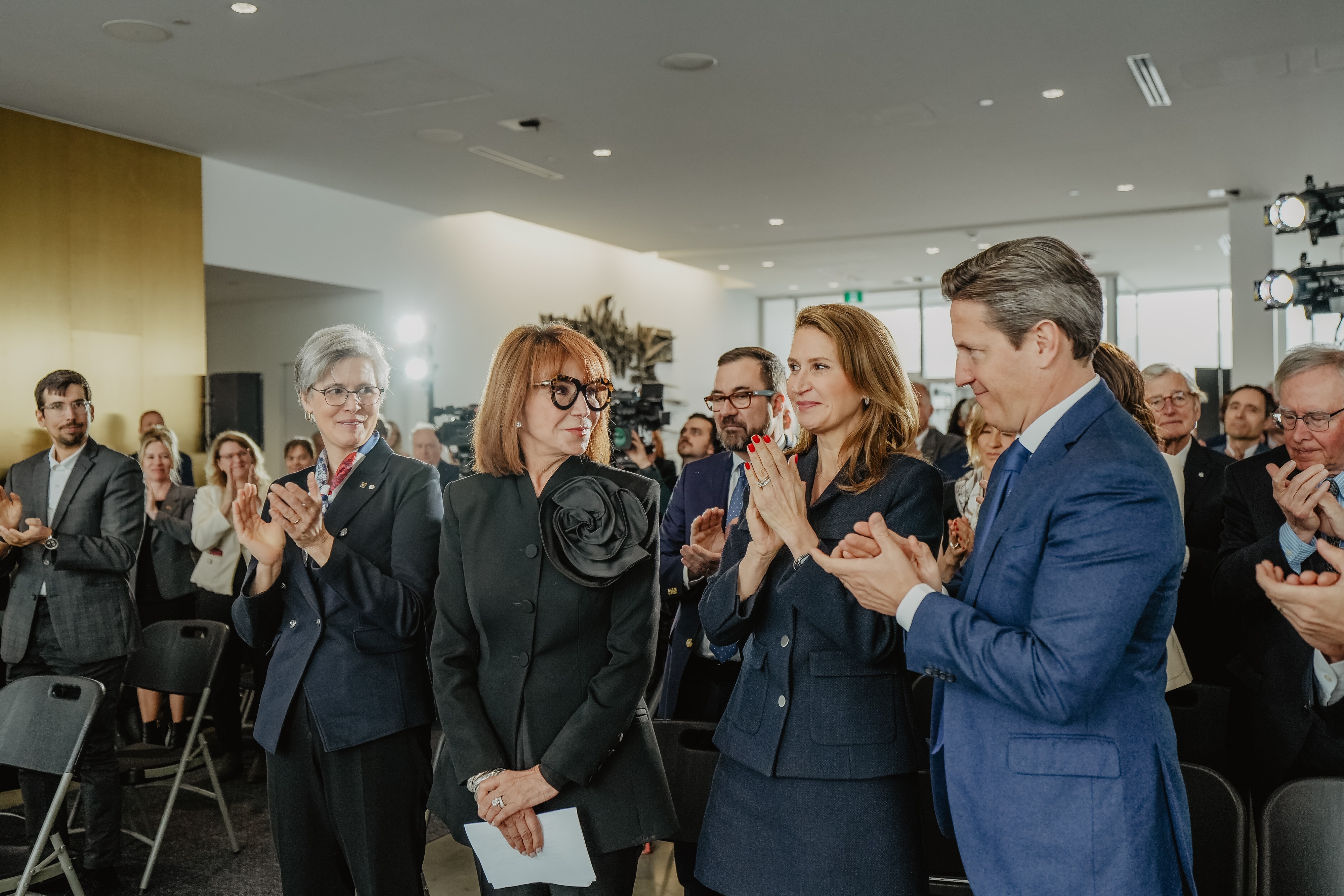 La rectrice de l’Université Laval, Sophie D’Amours en compagnie de l’épouse de l’honorable Brian Mulroney, Mila Mulroney ainsi que deux de leurs enfants, Caroline et Mark, lors de la clôture de Campagne majeure du Carrefour International Brian-Mulroney.