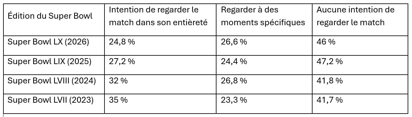 L’enquête révèle aussi que seulement 24,8 % des répondantes et répondants ont l’intention de regarder le match dans son entièreté, le plus bas niveau enregistré depuis la première édition du Baromètre sur le Super Bowl publiée en 2023 :