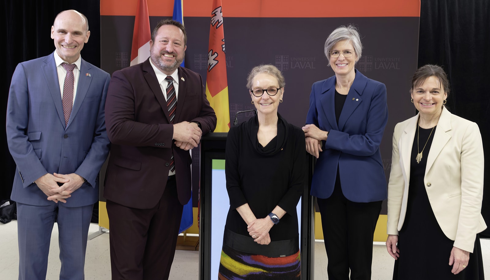 Jean-Yves Duclos, député fédéral de Québec-Centre, Steeve Lavoie, député de Beauport-Limoilou, Marie Audette, doyenne par intérim de la Faculté de médecine dentaire, Sophie D'Amours, rectrice, et Cathia Bergeron, vice-rectrice aux études et aux affaires étudiantes, responsable de la santé, lors de l'annonce du financement sur le campus le 30 mars.